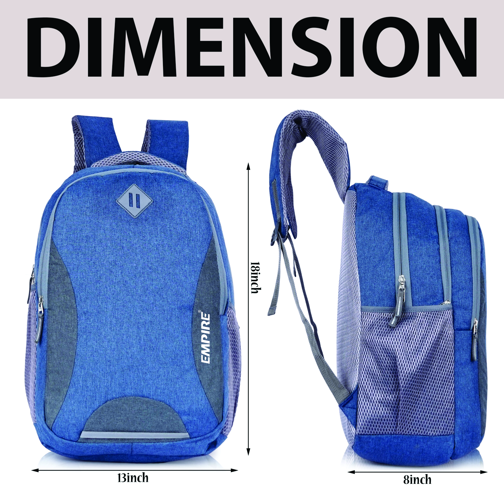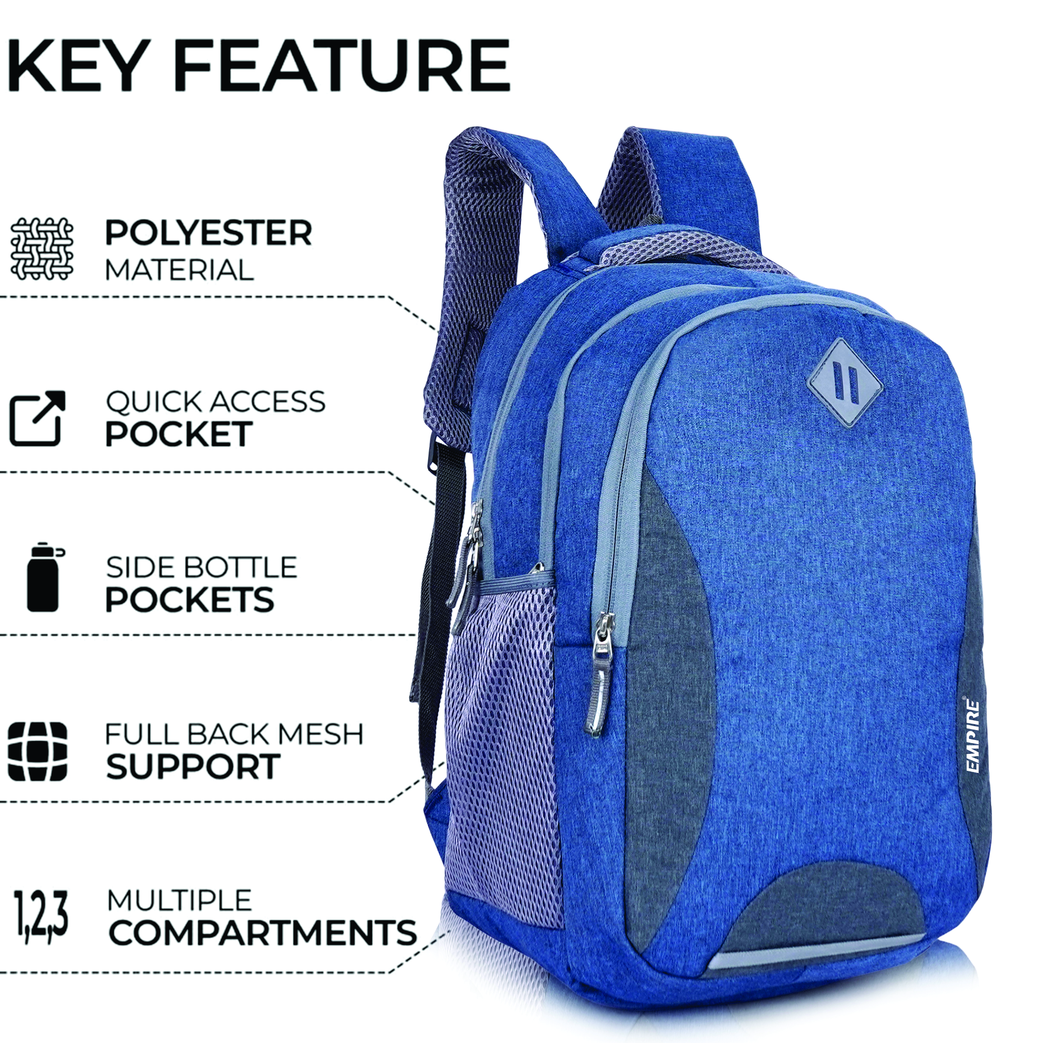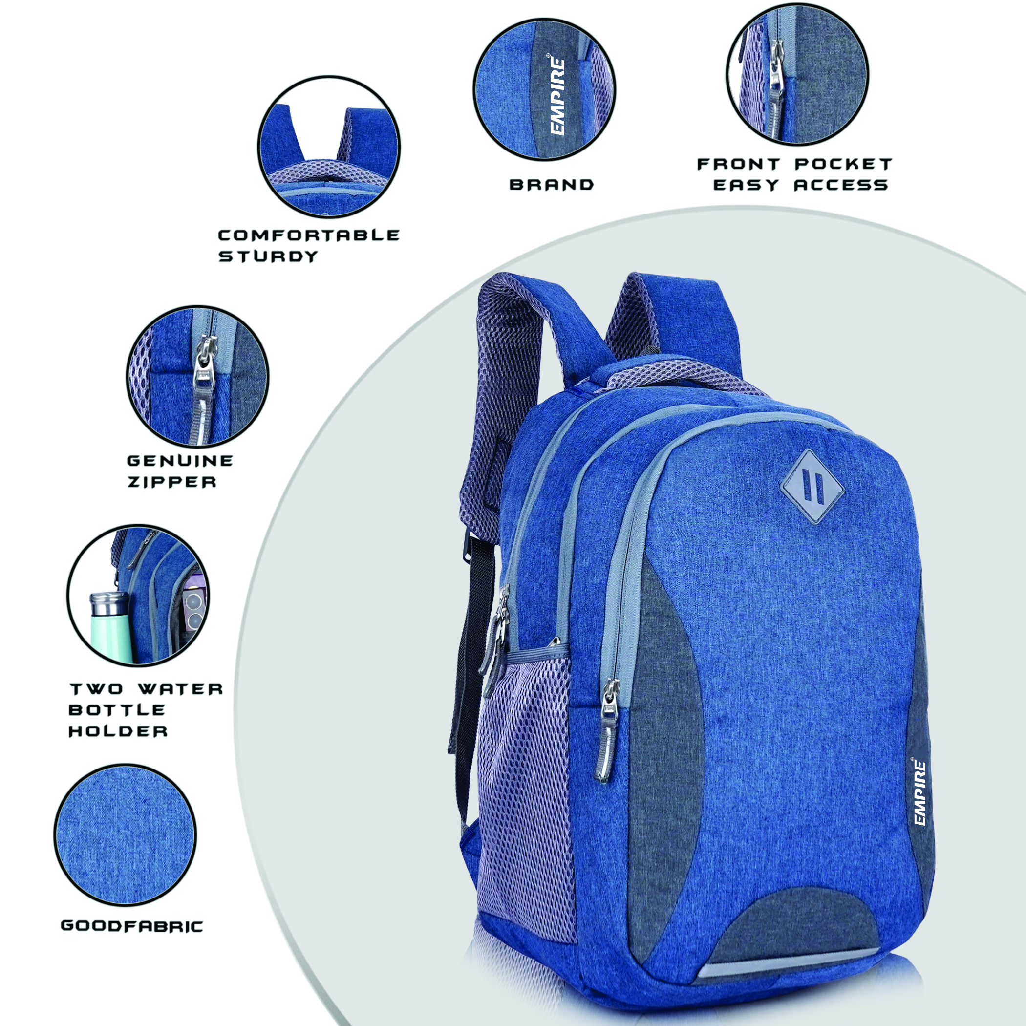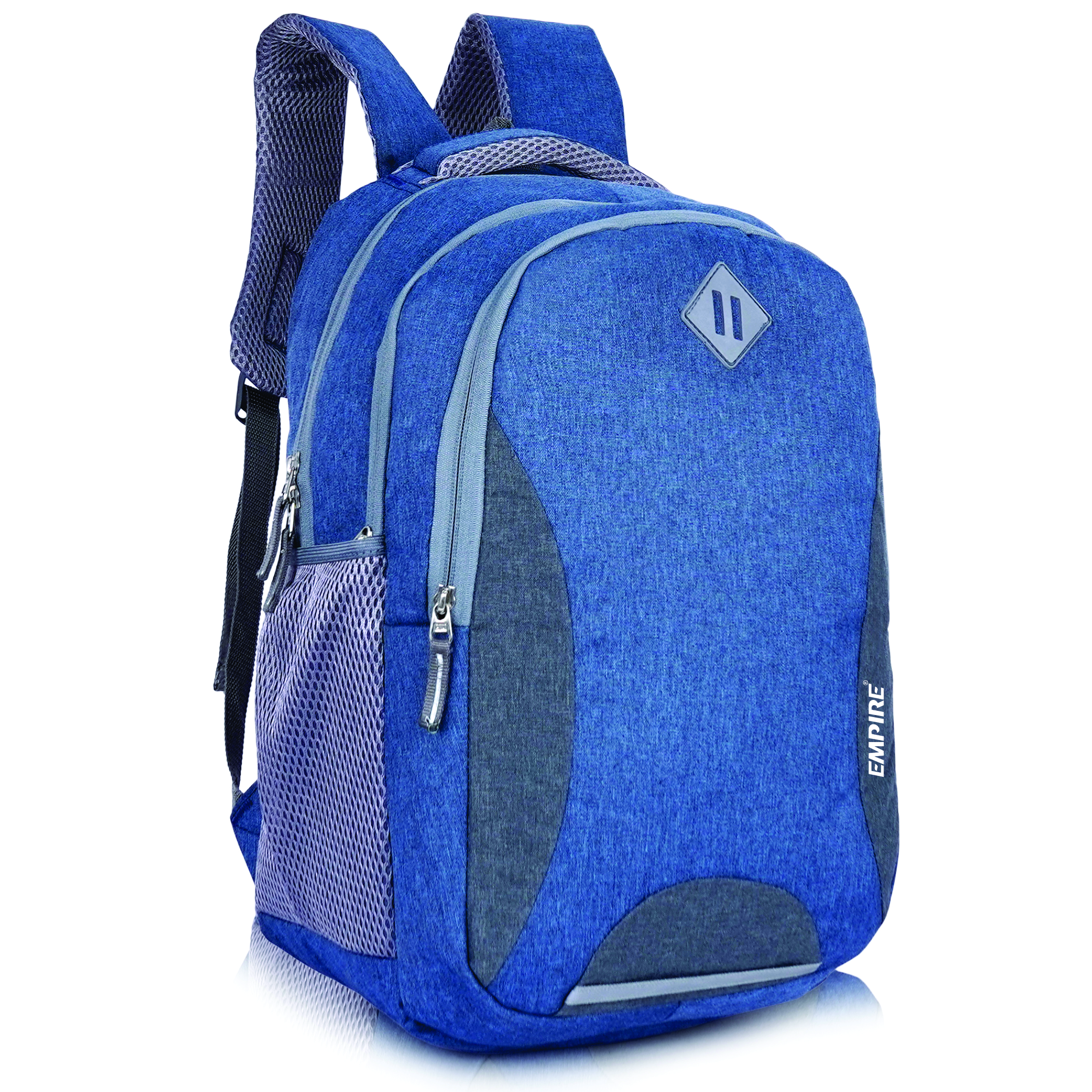 Every feature is thoughtfully executed β a spacious main compartment with dedicated padded laptop sleeve, a front organiser compartment, and mesh side water bottle pockets ensure complete daily organisation. The padded mesh shoulder straps and ventilated mesh back panel deliver all-day ergonomic comfort, while the padded top handle adds convenient grab-and-go versatility. The reflective safety strip at the front base provides essential low-light visibility, and the grey Empire logo patch with white EMPIRE text brands this backpack with quiet, confident prestige.