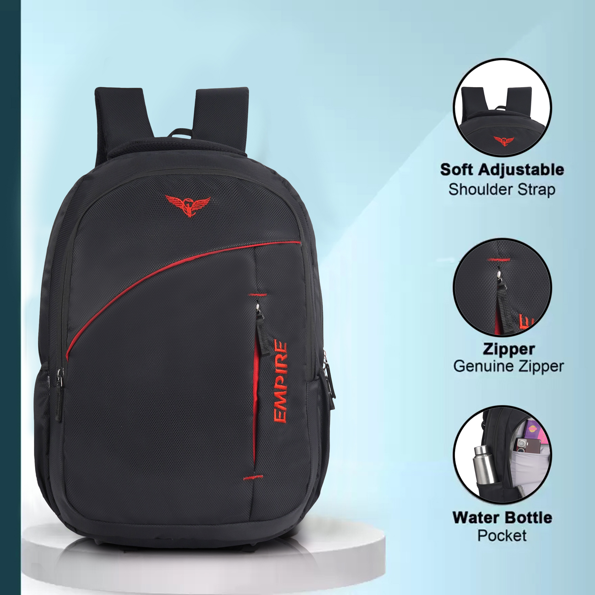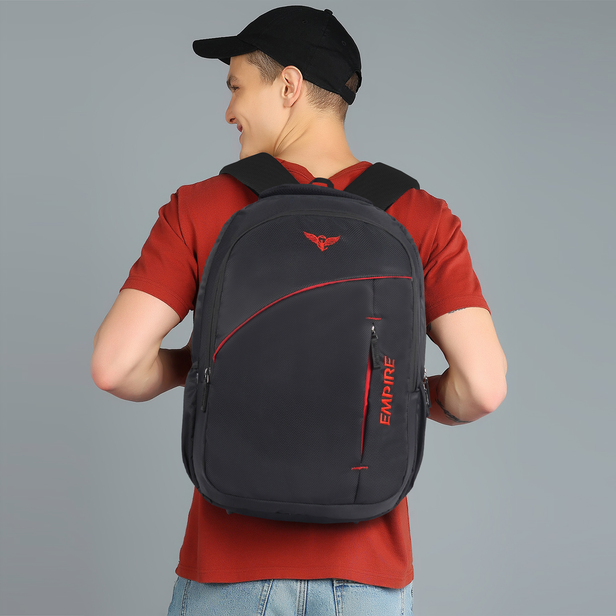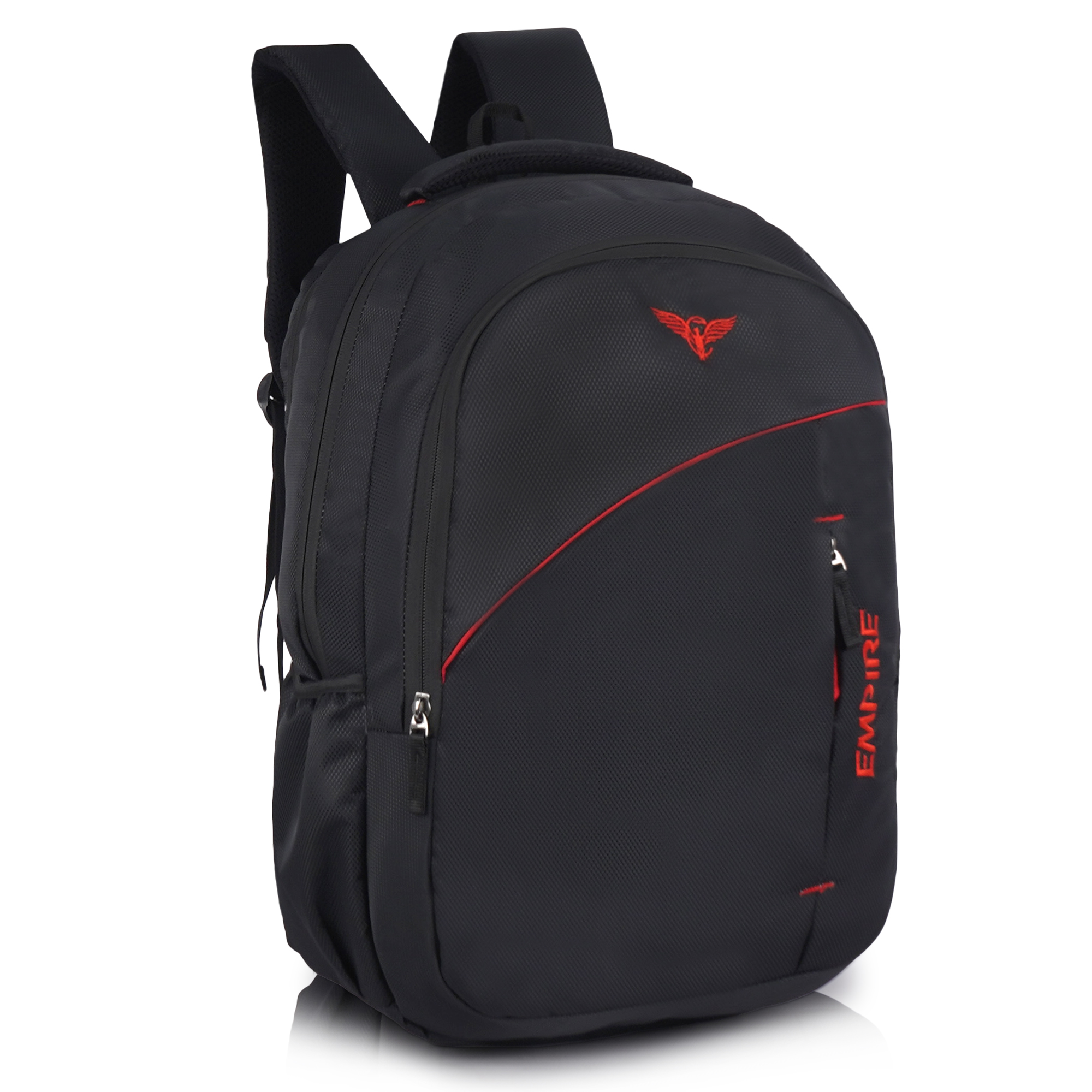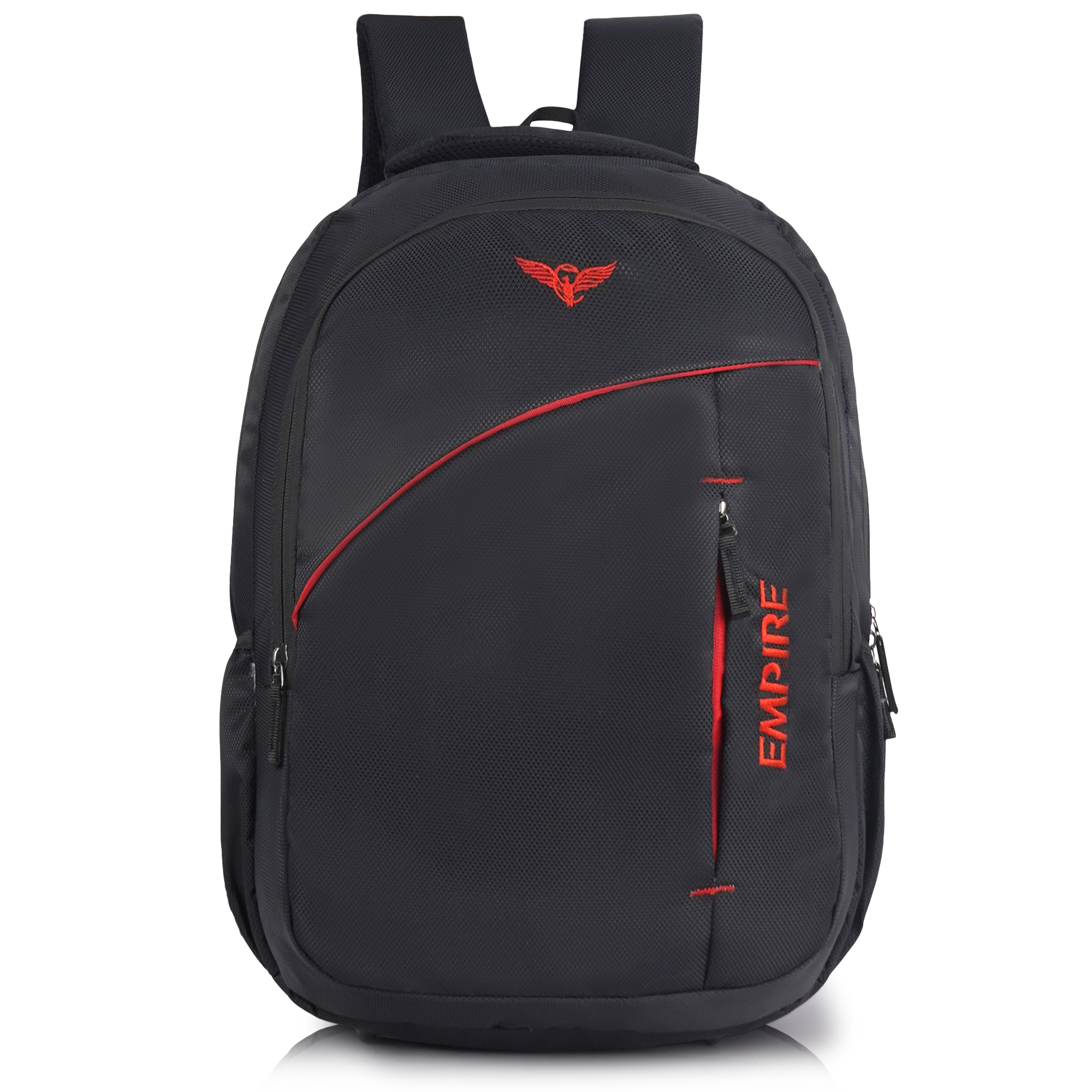 The first thing you’ll notice is the sweeping diagonal red accent stripe that runs across the front panel — a design detail that instantly sets this bag apart from ordinary backpacks. Paired with the iconic red Empire eagle logo at the top and the bold vertical “EMPIRE” branding embroidered along the right side panel, this backpack commands attention from every angle. The contrast of red against the deep black textured polyester gives it a powerful, energetic look that works equally well in a classroom, a boardroom, or on the road.