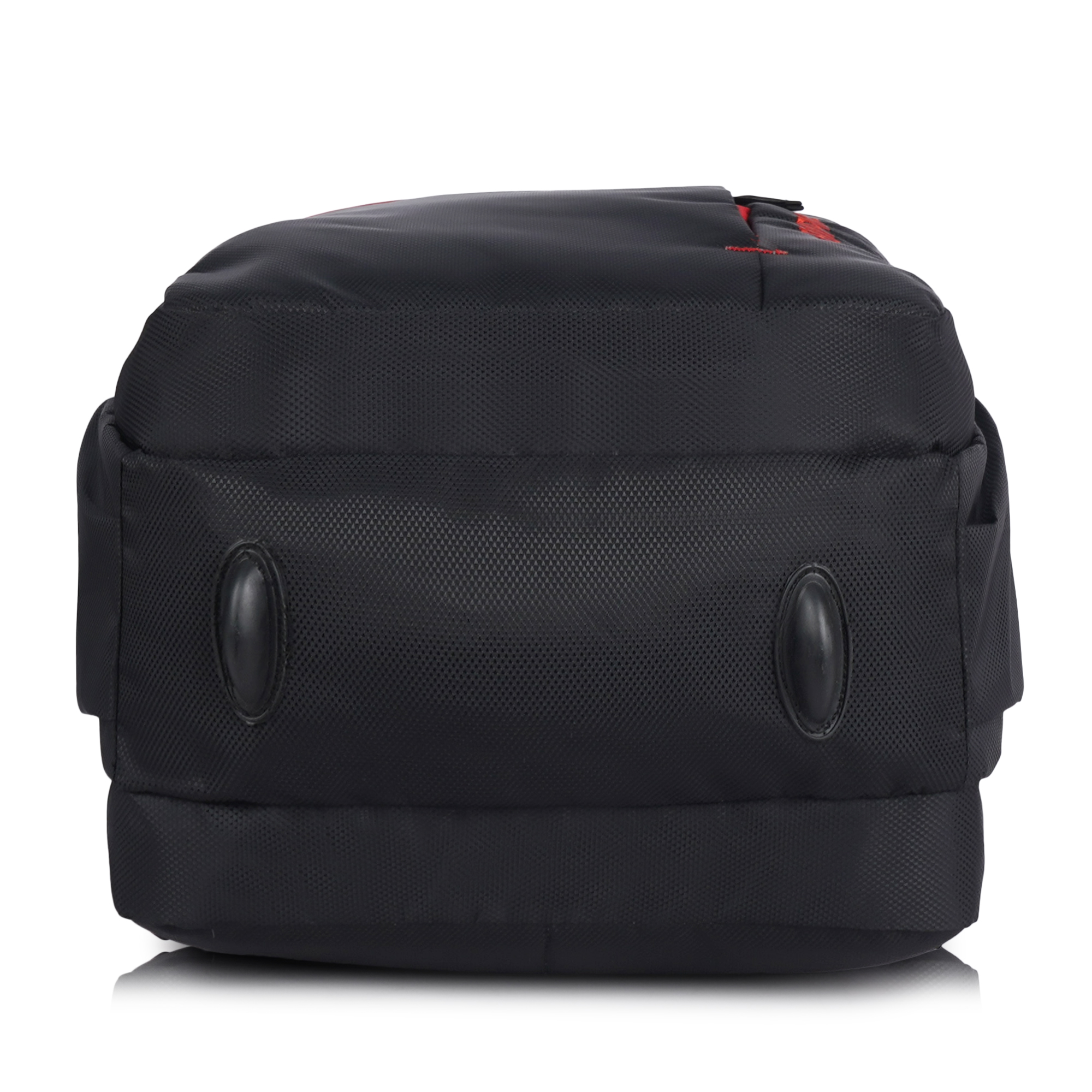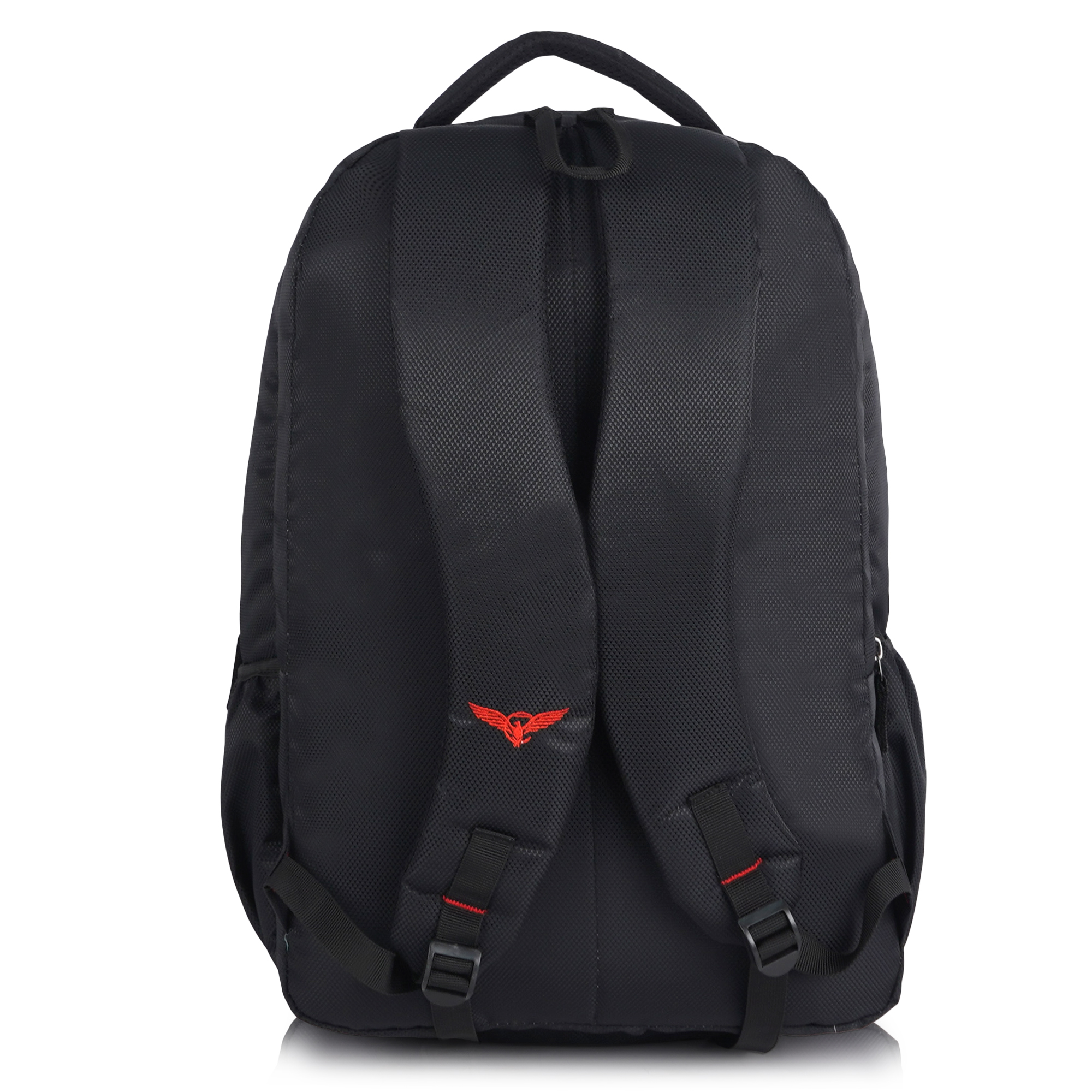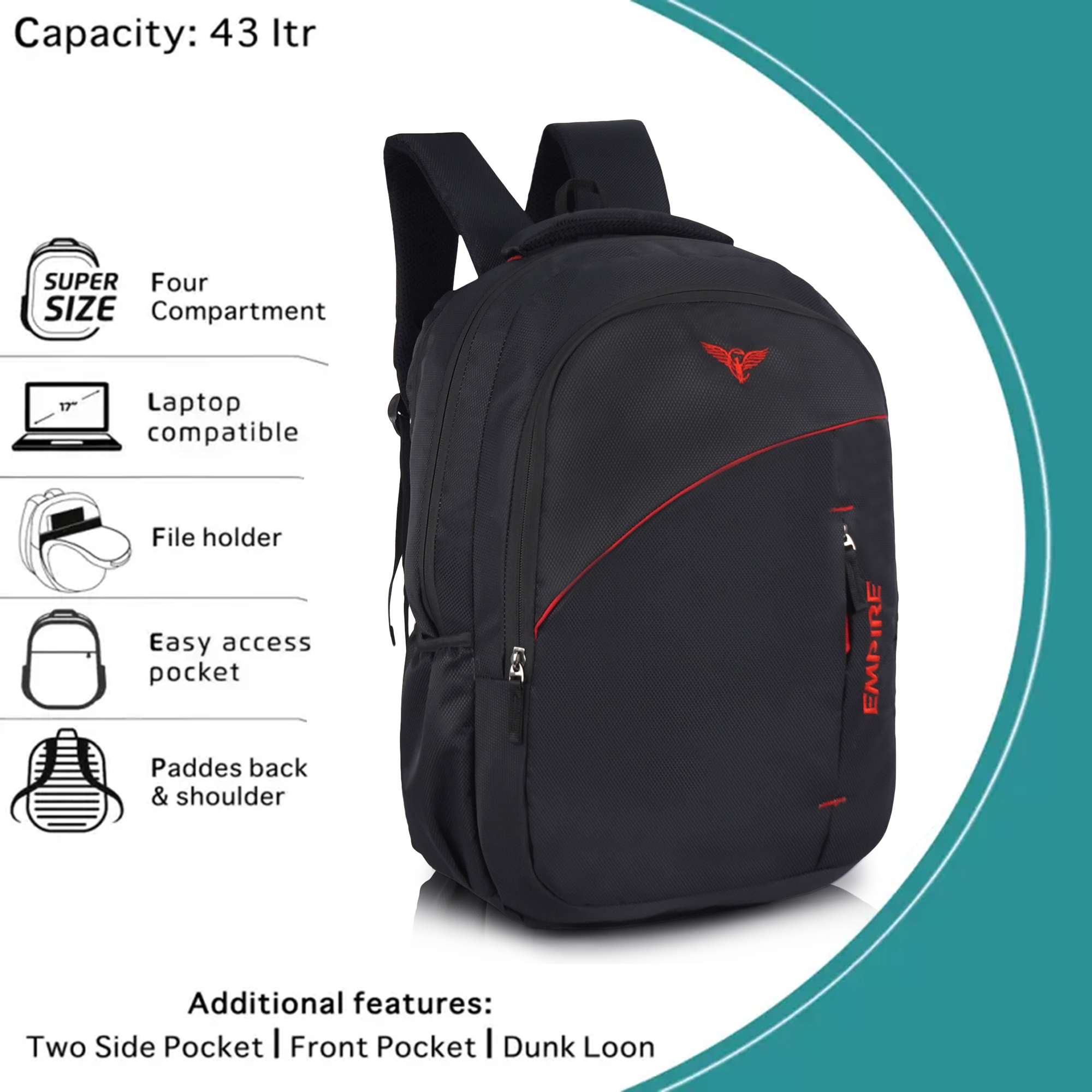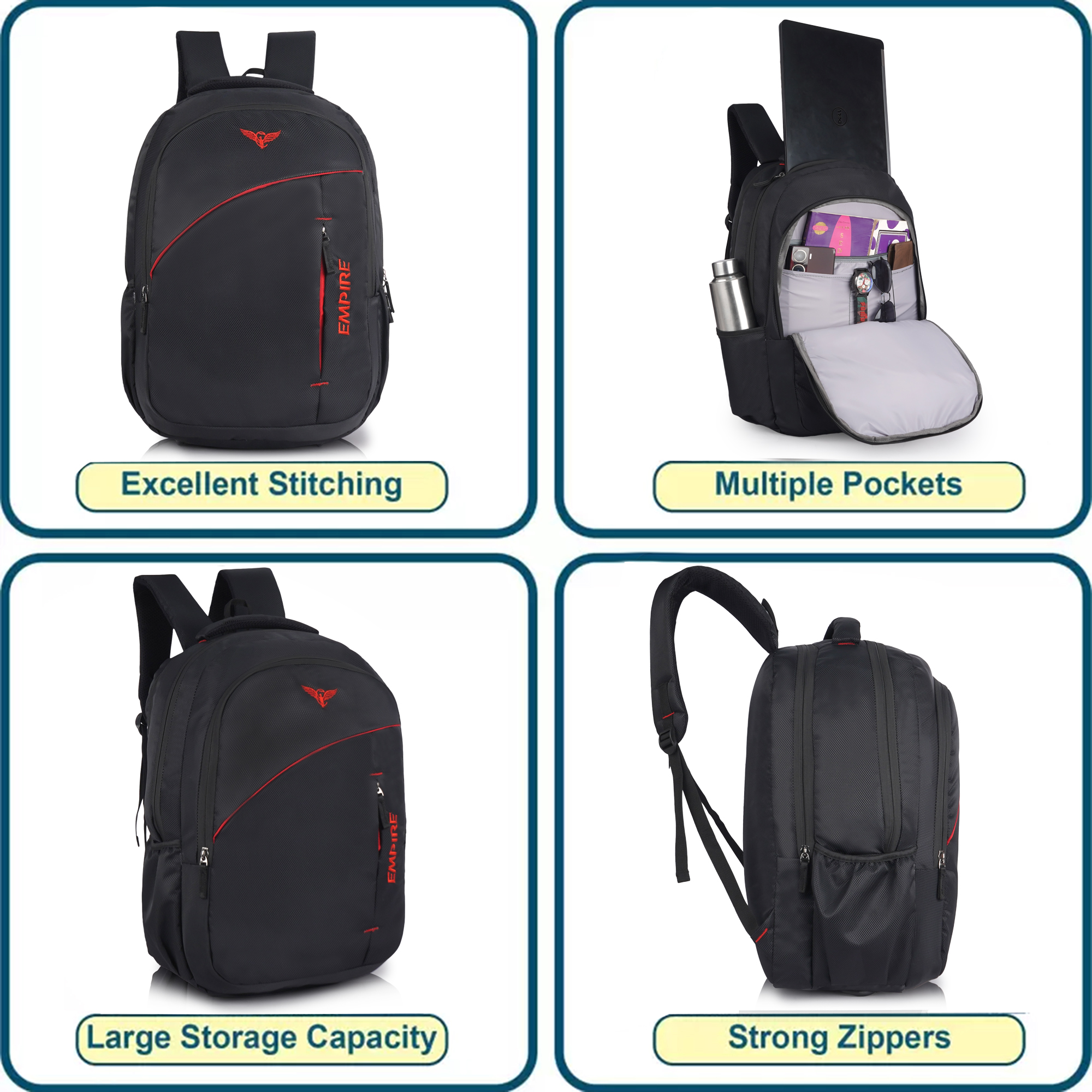 The first thing you’ll notice is the sweeping diagonal red accent stripe that runs across the front panel — a design detail that instantly sets this bag apart from ordinary backpacks. Paired with the iconic red Empire eagle logo at the top and the bold vertical “EMPIRE” branding embroidered along the right side panel, this backpack commands attention from every angle. The contrast of red against the deep black textured polyester gives it a powerful, energetic look that works equally well in a classroom, a boardroom, or on the road.