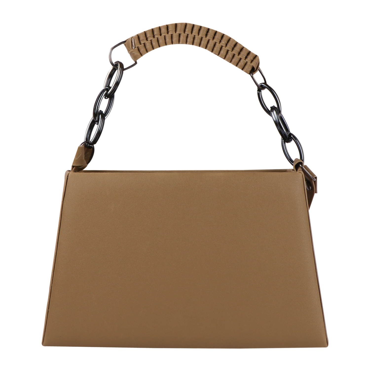 The ruched pleated leather handle arches gracefully across the top in matching khaki, while the chunky gunmetal oval link chain drops on either side in bold, industrial contrast — warm organic khaki leather meeting cool dark metal in a pairing that is both fashion-forward and deeply satisfying. The detachable flat crossbody strap, finished with distinctive zigzag edge stitching, adds a unique artisanal detail that elevates the design further still.