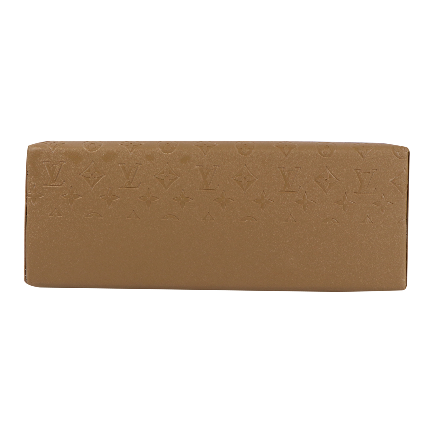 The warm, dusty khaki tone gives the wide structured trapeze silhouette a grounded, earthy richness that feels both rugged and refined. Against this warm canvas, the all-over monogram symbol embossing — featuring diamonds, florals, and signature brand motifs repeated in perfect symmetry — creates a tonal luxury pattern that speaks of prestige and craftsmanship in equal measure. The embossing catches the light beautifully across the khaki surface, revealing new depths of detail with every shift in angle.